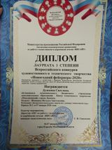 Учащиеся творческого объединения «Мастерица» Душкина Светлана и Федянина Софья приняли участие во Всероссийском конкурсе художественного и технического творчества «Новогодний фейерверк – 2020». Конкурс проводится в рамках Всероссийского фестиваля детского и юношеского творчества «Хоровод традиций – 2020», который входит в Перечень олимпиад и иных интеллектуальных и (или) творческих конкурсов, мероприятий, направленных на развитие интеллектуальных и творческих способностей учащихся. Воспитанницы Центра совершили путешествие в столицу нашей Родины и город Королев, встретились с Дедом Морозом и главным символом Нового года – красавицей Кремлёвской ёлкой, а также успешно представили на конкурсе свои творческие работы.