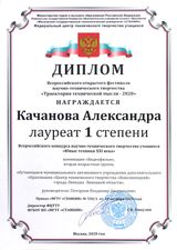 По итогам Всероссийского открытого фестиваля научно-технического творчества "Траектория технической мысли-2020", Александра Качанова стала Лауреатом 1 степени Всероссийского конкурса НТТУ "Юные техники XXI века.