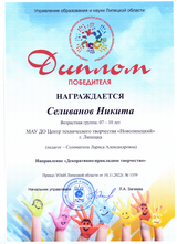 Учащийся творческого объединения «Арт – Декор» (педагог Соломатина Лариса Александровна) Селиванов Никита представил свою работу в номинации «Декоративно-прикладное творчество» и стал победителем акции.