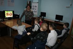 Педагог Попова Е.В. в кабинете компьютерных технологий провела познавательное мероприятие «Чему учит экология?». Ребята смотрели мультфильм, отвечали на вопросы викторины, играли и рассуждали.